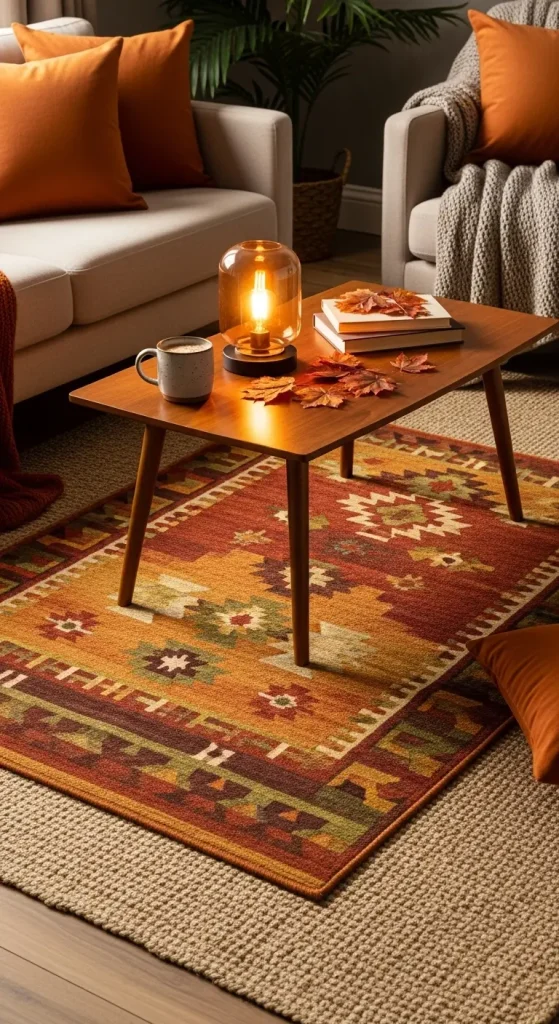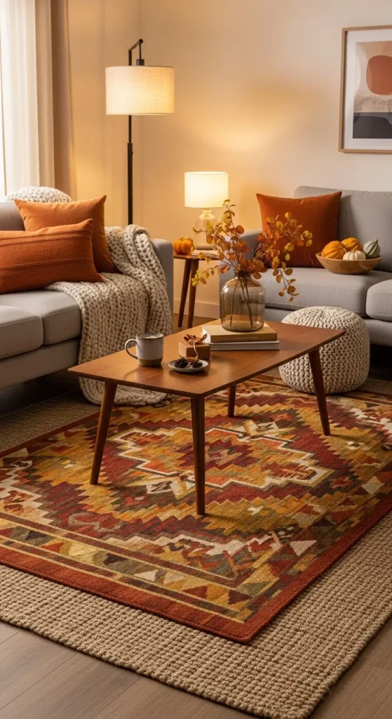 Layering rugs adds instant warmth and visual interest. Start with a neutral jute or sisal rug, then layer a patterned rug on top. This works especially well in living rooms, bedrooms, or entryways. Choose patterns in warm tones to tie everything together.