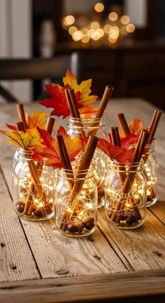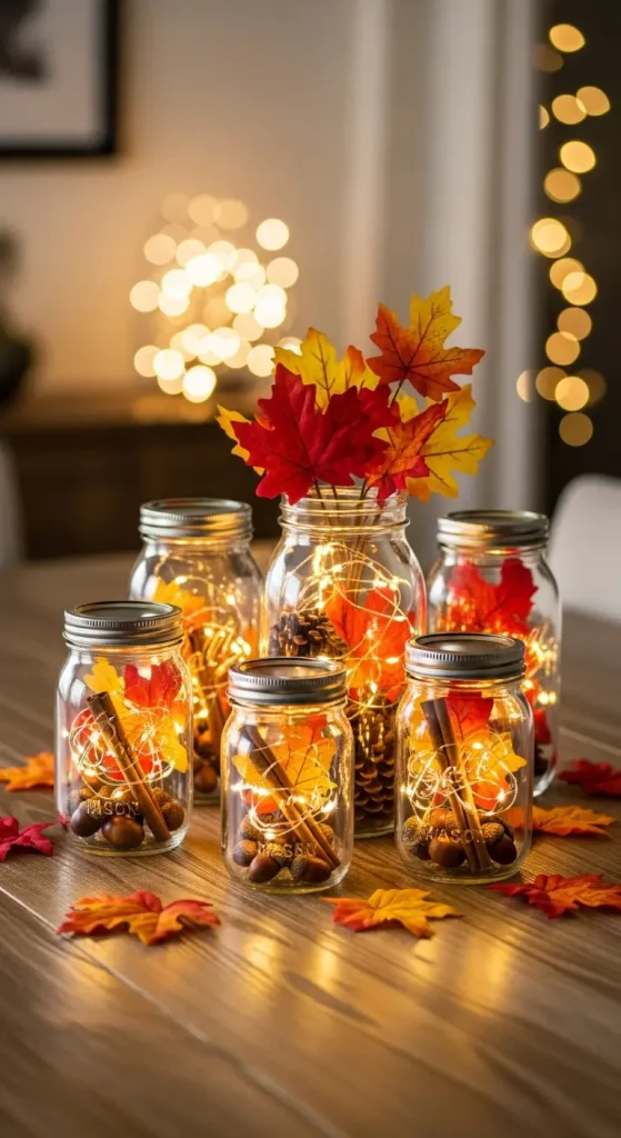 Mason jars are inexpensive, versatile, and perfect for DIY decor. Fill them with fairy lights, acorns, faux autumn leaves, or cinnamon sticks. Group several jars together on your dining table or mantel for a cozy glow.