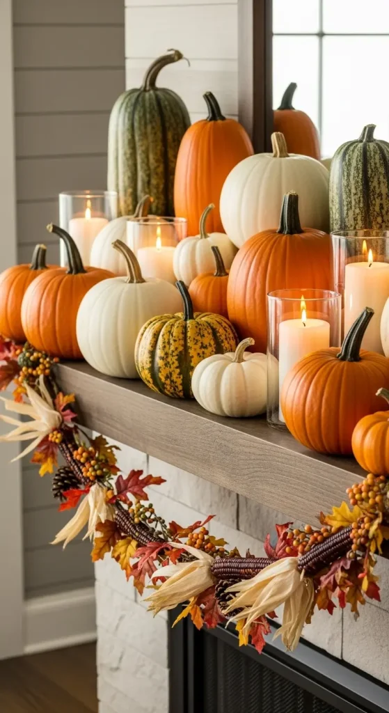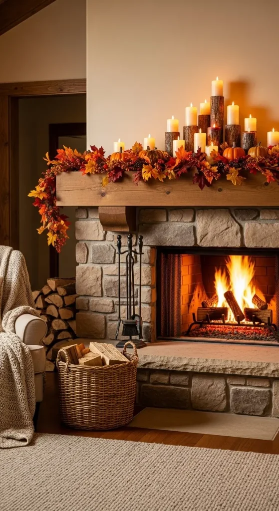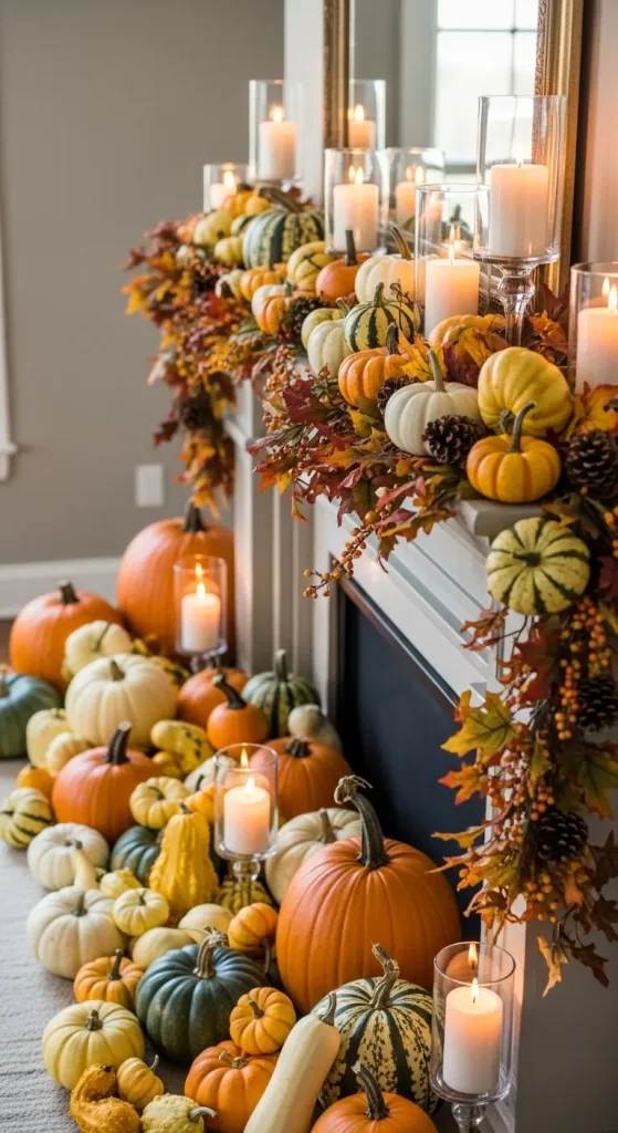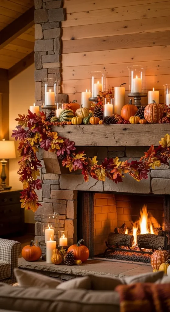 The mantel is often the focal point of a living room, and fall is the perfect time to decorate it. Layer candles, garlands, pumpkins, and seasonal foliage. Use varying heights for depth and interest.