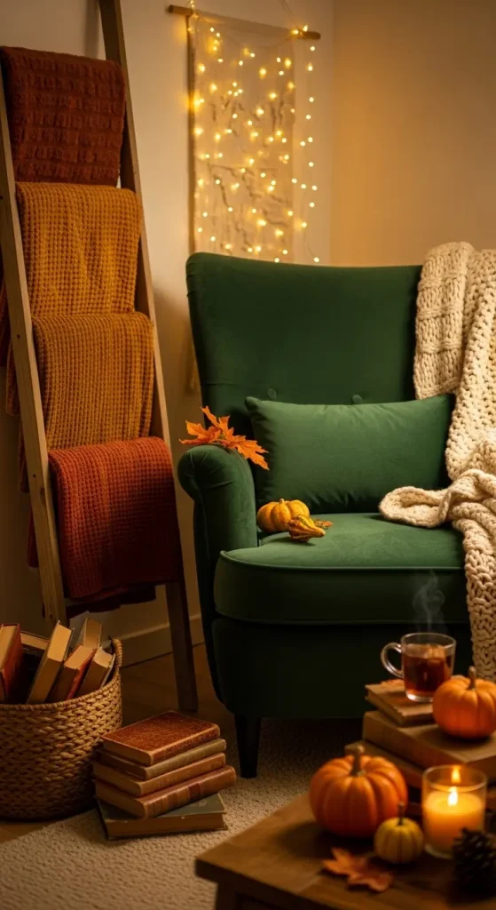 Dedicate a corner to cozy reading sessions. Add a blanket ladder, soft pillows, a warm throw, and ambient lighting. Include a small side table for tea or coffee, and stack a few favorite books for easy reach.