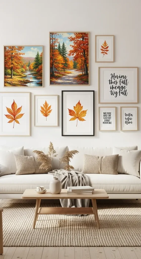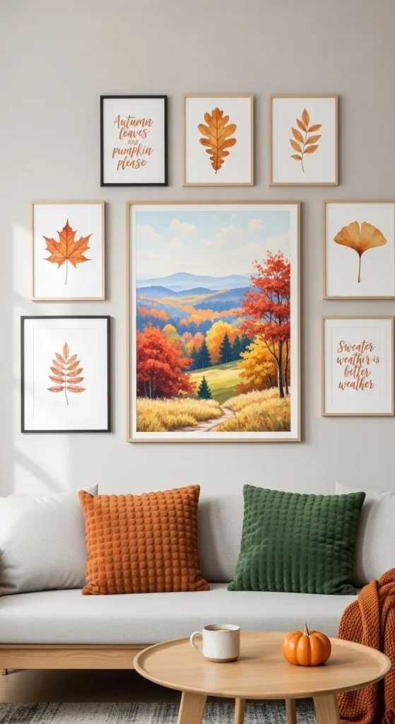 Swap out summer prints for seasonal art. Think autumn landscapes, watercolor leaves, or framed seasonal quotes. This simple swap can completely change the mood of a room.