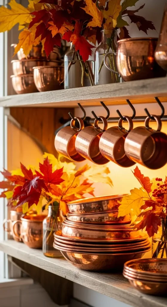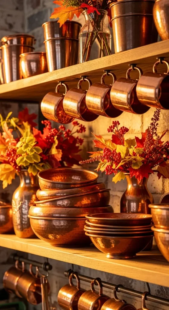 Copper brings a rich, warm metallic touch to your home. Add small pieces like mugs, trays, or candle holders. Copper pairs beautifully with autumn tones and natural textures like wood and linen.