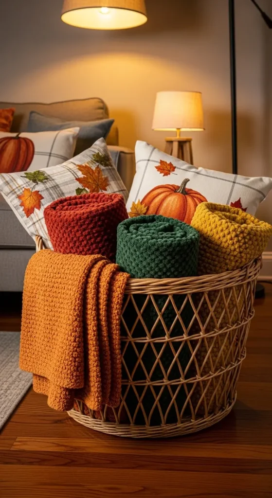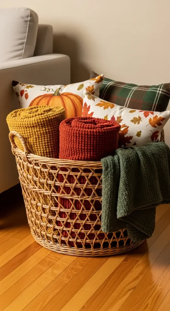 Baskets are perfect for both storage and style. Use them to hold blankets, pillows, or seasonal magazines. Opt for natural woven baskets in warm tones to match the season.
