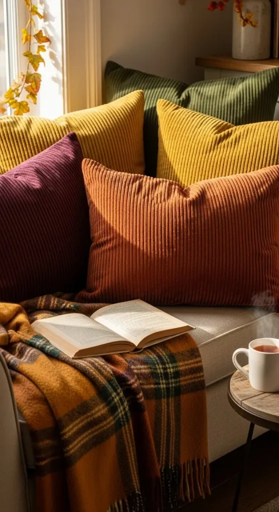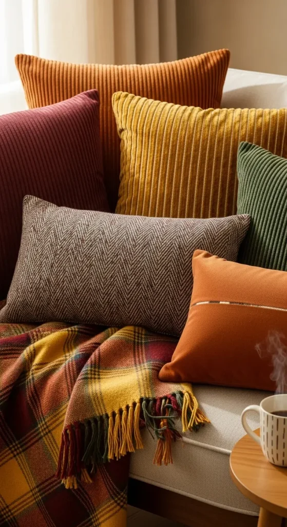 Switching out your pillow covers is one of the fastest ways to update a room for fall. Look for textures like corduroy, velvet, and tweed. Patterns like plaid, houndstooth, or subtle leaf prints work beautifully. Mixing different fabrics and patterns in complementary colors adds warmth and personality.