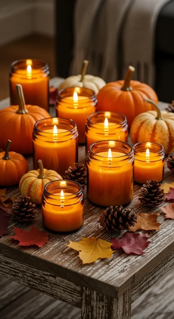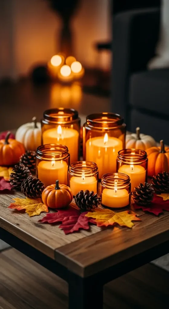 Lighting is key to creating a cozy vibe. Amber glass candles not only give off a warm, golden glow but also add a rustic touch to your decor. Choose scents like cinnamon, pumpkin spice, apple cider, or vanilla bean for the ultimate autumn experience. Arrange candles of varying heights on trays, mantels, and shelves.