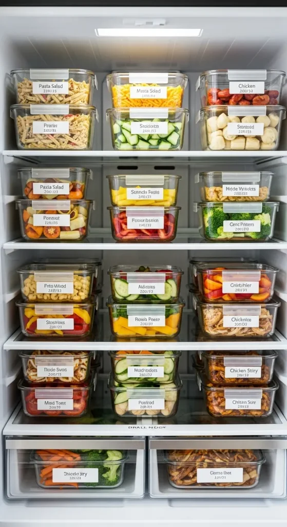Use airtight containers, label them with the meal name and date, and stack them neatly in the fridge or freezer.