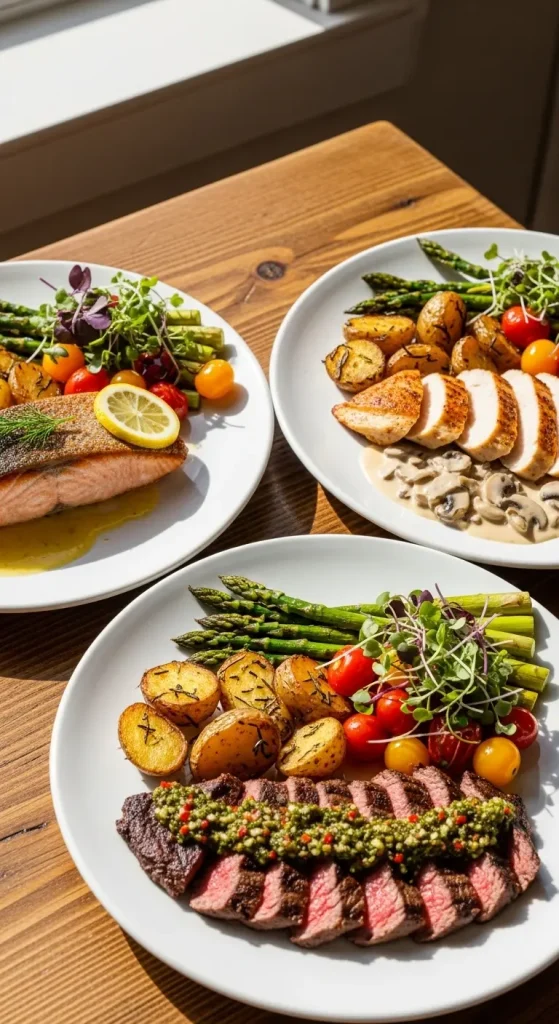 Choose versatile proteins and sides that you can combine in different ways for variety without extra cooking.