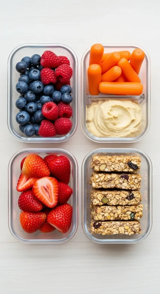 Prep easy grab-and-go snacks like cut fruit, hummus with veggies, or energy bites.